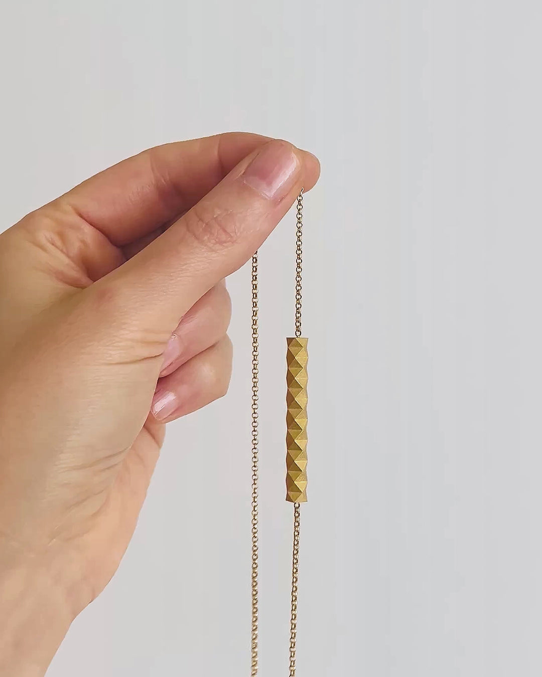 Inspiriert von den Möglichkeiten des Faltens bringt der große Anhänger XFPD1284L die Ästhetik gefalteter Strukturen in eine klare, grafische Form. Seine facettierte Oberfläche entsteht in einem präzisen Herstellungsprozess in Pforzheim: Er wird im 3D-Druckverfahren gefertigt, anschließend aus recycelten und zertifizierten Edelmetallen gegossen und von Hand versäubert. Um den charakteristischen Look zu bewahren, bleibt die Oberfläche nach dem Guss bewusst unpoliert — mit einer feinen Textur und einem dezenten Glanz.