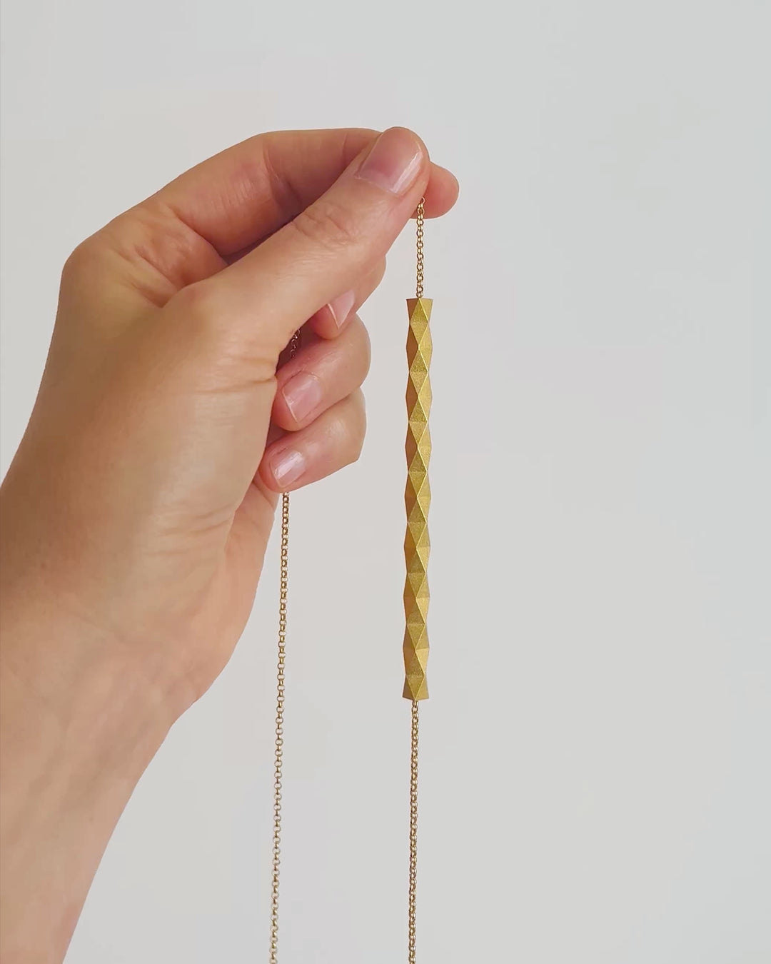 Inspiriert von den Möglichkeiten des Faltens bringt der extra große Anhänger XFPD1284XL die Ästhetik gefalteter Strukturen in eine klare, grafische Form. Seine facettierte Oberfläche entsteht in einem präzisen Herstellungsprozess in Pforzheim: Er wird im 3D-Druckverfahren gefertigt, anschließend aus recycelten und zertifizierten Edelmetallen gegossen und von Hand versäubert. Um den charakteristischen Look zu bewahren, bleibt die Oberfläche nach dem Guss bewusst unpoliert — mit einer feinen Textur und einem dezenten Glanz.